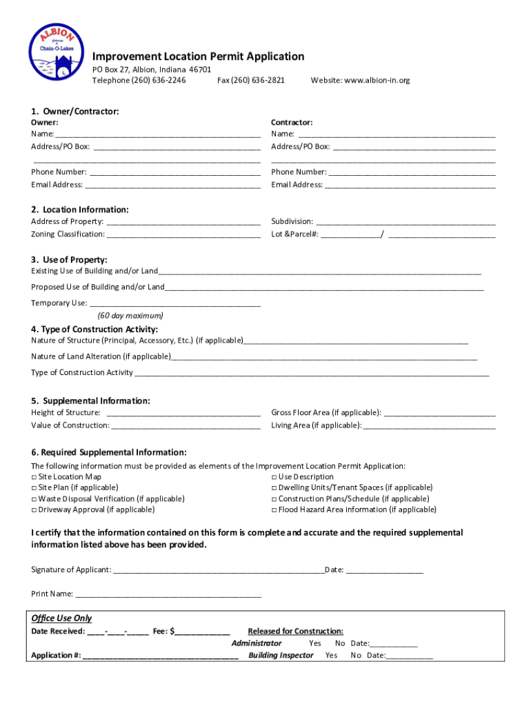 Improvement Location Permit Application PO Box 27, Albion, Indiana 46701 Telephone (260) 6362246 Fax (260) 6362821Website: www.albionin.org1. Owner/Contractor: Owner: Name: ___ Address/PO Box: ___