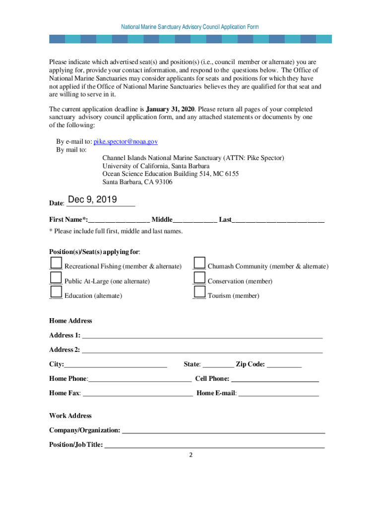 National Marine Sanctuary Advisory Council Application Formation Marine Sanctuary Advisory Council Application Form Before applying for sanctuary advisory council membership, please review: (1) the