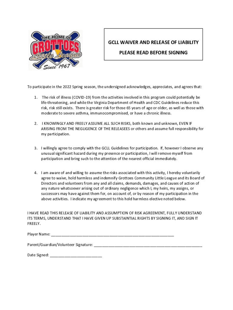 Anyone participating in activities or events where potential risks are involved may be required to file a GCLL waiver and release form.