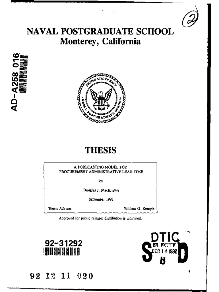 NAVAL POSTGRADUATE SCHOOL Monterey, California000i;STATE, THESIS A FORECASTING MODEL FOR PROCUREMENT ADMINISTRATIVE LEAD TIME by Douglas J. MacKinnon September 1992 Thesis Advisor:William G. KempleApproved