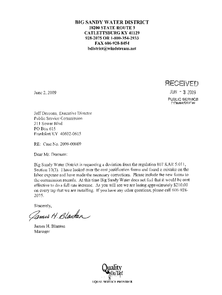 BIG SANDY WATER DISTRICT 18200 STATE ROUTE 3 CATLXTTSBURG KY 41129 9282075 OR 18003542933 FAX 6069288454 bdistrict@windstream.netBV JUN 3 2099June 2,2009PURL IC SERVICE C:RR/IRA IS!? I n Jeff Rouen,