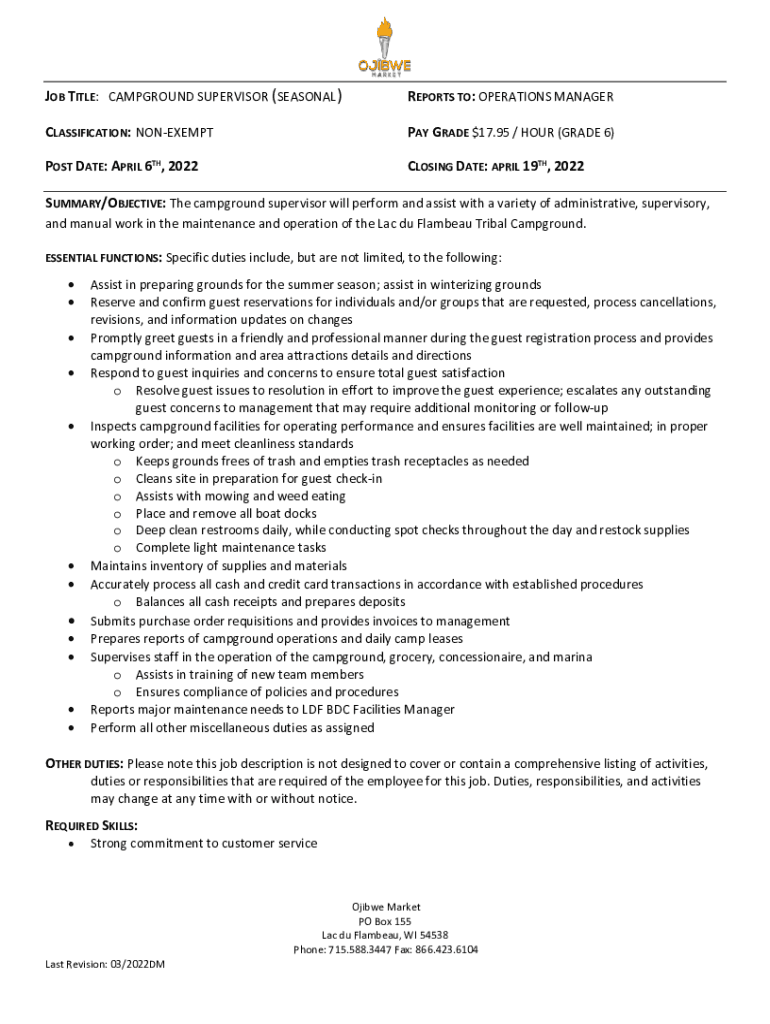 JOB TITLE: CAMPGROUND SUPERVISOR (SEASONAL)REPORTS TO: OPERATIONS MANAGERCLASSIFICATION: NONEXEMPT GRADE $17.95 / HOUR (GRADE 6)POST DATE: APRIL 6TH, 2022CLOSING DATE: APRIL 19TH, 2022SUMMARY/OBJECTIVE: