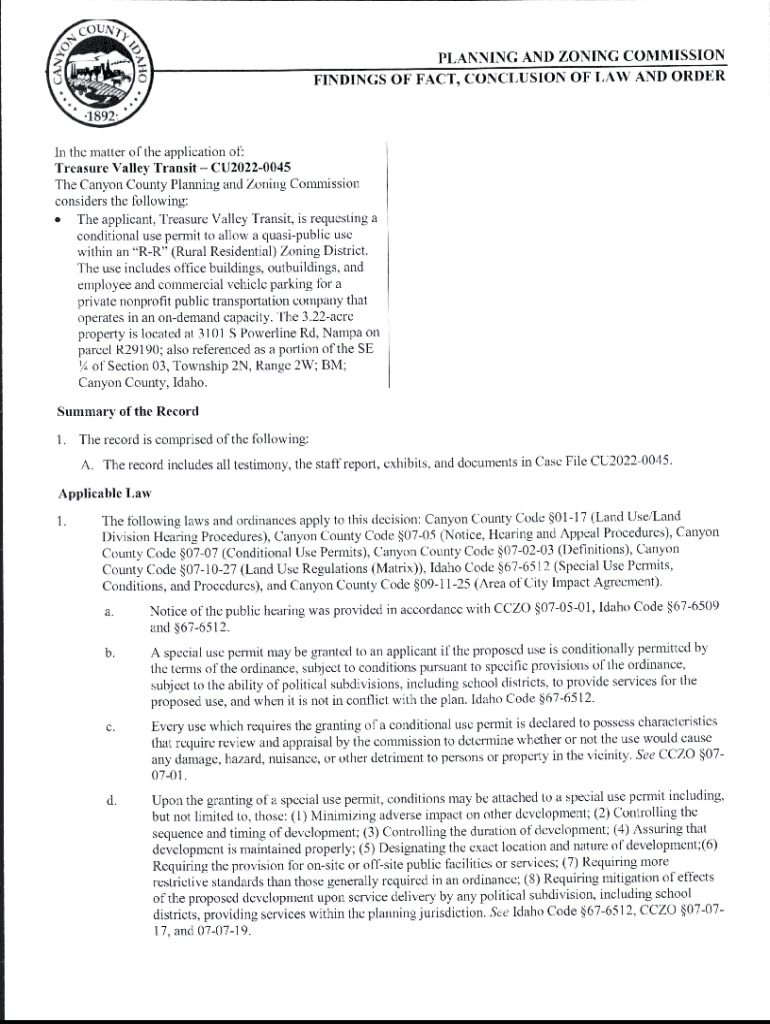 Planning and Zoning Commission Treasure Valley Transit Conditional Use Permit CU20220045 Hearing Date: April 6, 2023, Applicant: Treasure Valley Transit Staff: Jenna Petrol, Planner II Jenna.petroll@canyoncounty.id.gov