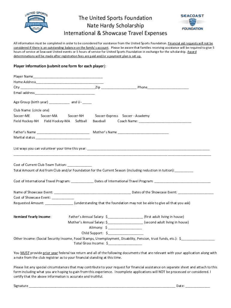 The United Sports Foundation Nate Hardy Scholarship International & Showcase Travel Expenses All information must be completed in order to be considered for assistance from the United Sports Foundation.