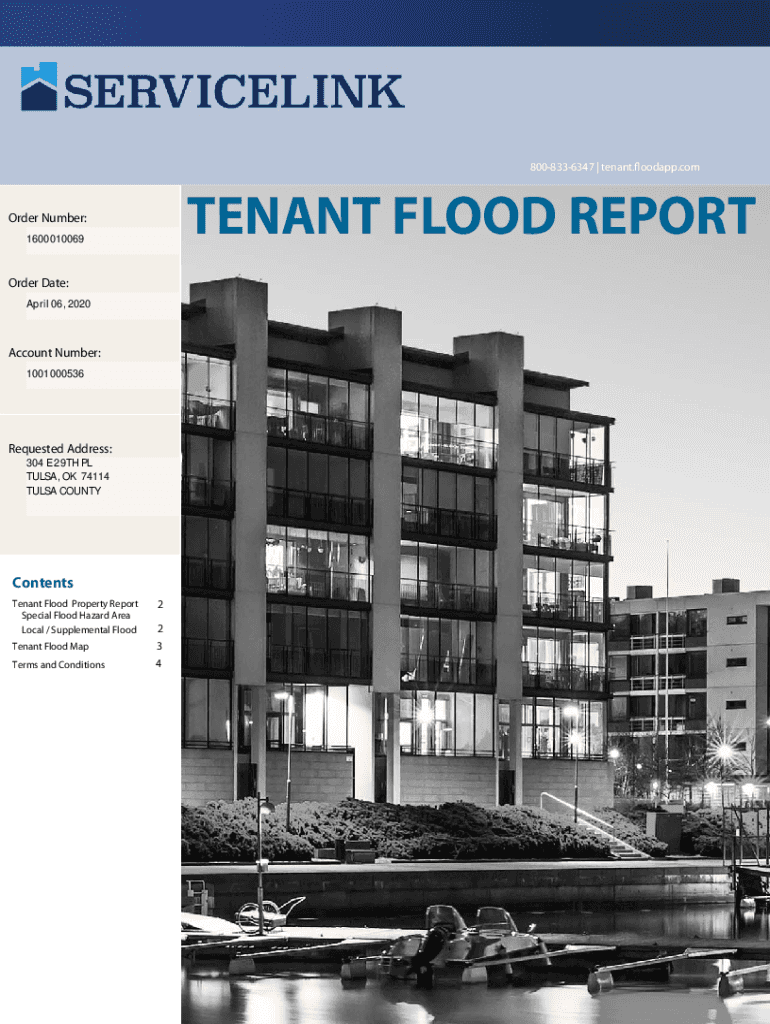 8008336347 | tenant. Flood app. Covenant FLOOD Reporter Number: 1600010069Order Date: April 06, 2020Account Number: 1001000536Requested Address: 304 E 29TH PL TULSA, OK 74114 TULSA COUNTYContents