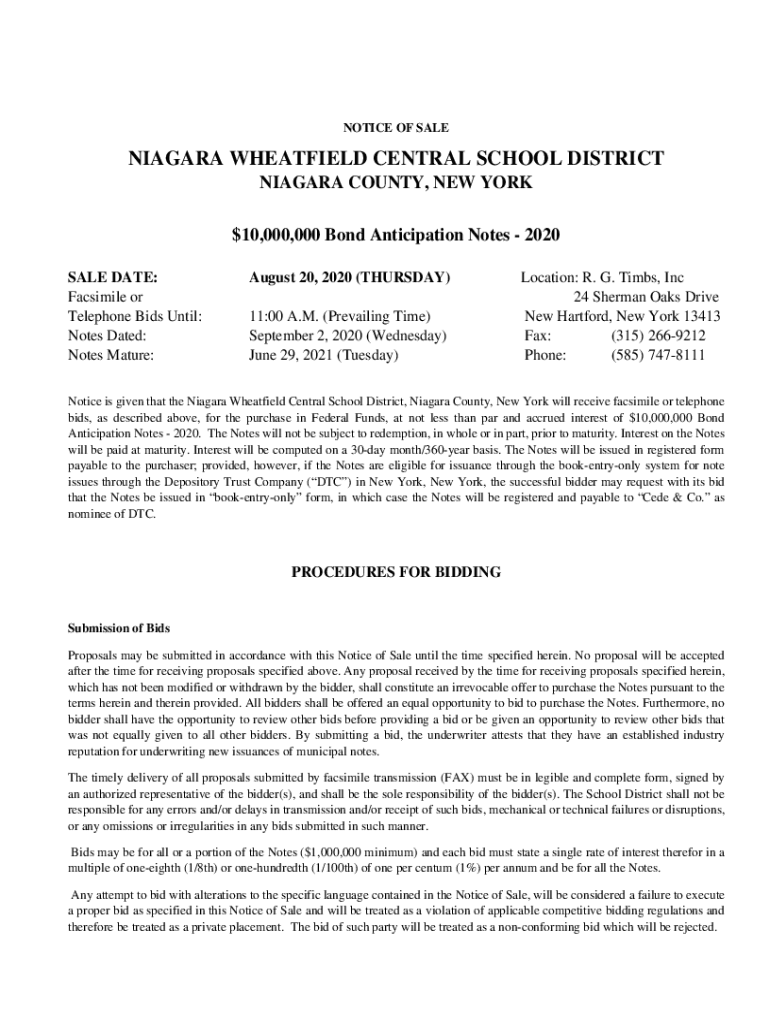 NOTICE OF SALENIAGARA HATFIELD CENTRAL SCHOOL DISTRICT NIAGARA COUNTY, NEW YORK $10,000,000 Bond Anticipation Notes 2020 SALE DATE: Facsimile or Telephone Bids Until: Notes Dated: Notes Mature:August