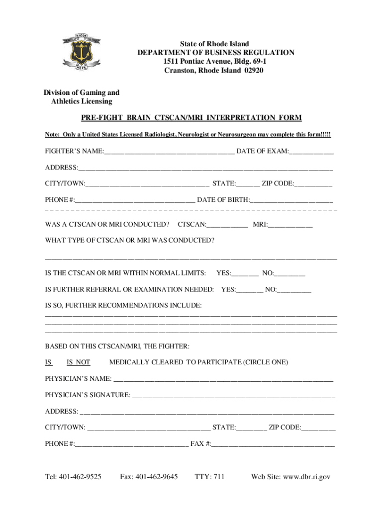 State of Rhode Island DEPARTMENT OF BUSINESS REGULATION 1511 Pontiac Avenue, Bldg. 691 Cranston, Rhode Island 02920 Division of Gaming and Athletics Licensing PREFLIGHT BRAIN SCAN/MRI INTERPRETATION