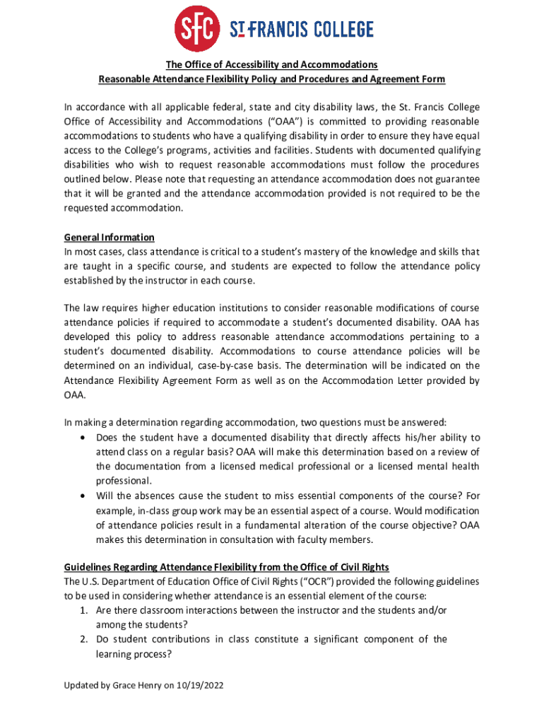 The Office of Accessibility and Accommodations Reasonable Attendance Flexibility Policy and Procedures and Agreement Form In accordance with all applicable federal, state and city disability laws,