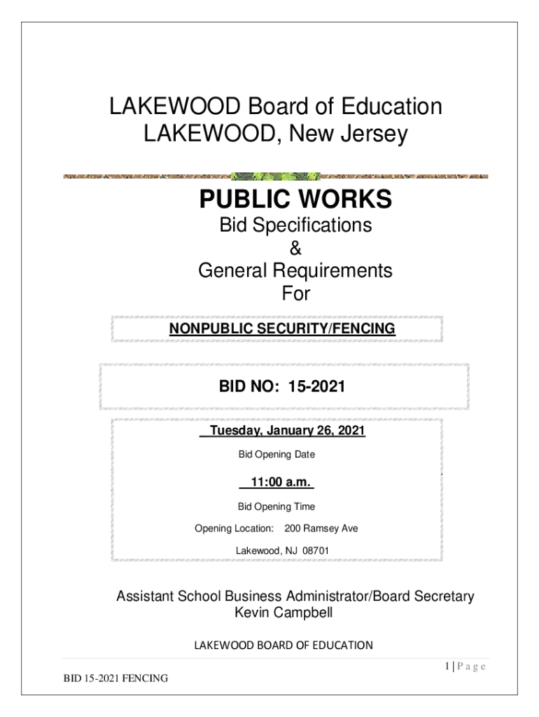 LAKEWOOD Board of Education LAKEWOOD, New JerseyPUBLIC WORKS Bid Specifications & General Requirements For NONPUBLIC SECURITY/FENCING BID NO: 152021 _ Tuesday, January 26, 2021, Bid Opening Date11:00