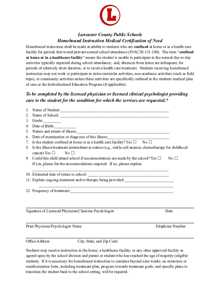 Lancaster County Public Schools Home bound Instruction Medical Certification of Need Home bound instruction shall be made available to students who are confined at home or in a health care facility