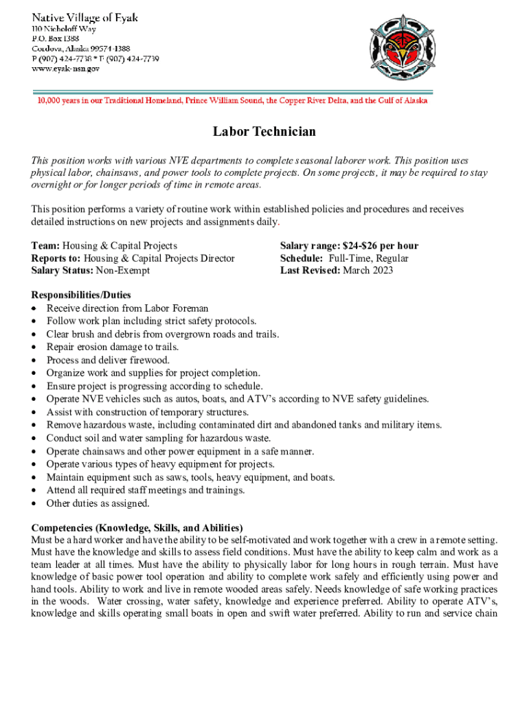 Labor Technician This position works with various EVE departments to complete seasonal laborer work. This position uses physical labor, chainsaws, and power tools to complete projects. On some projects,