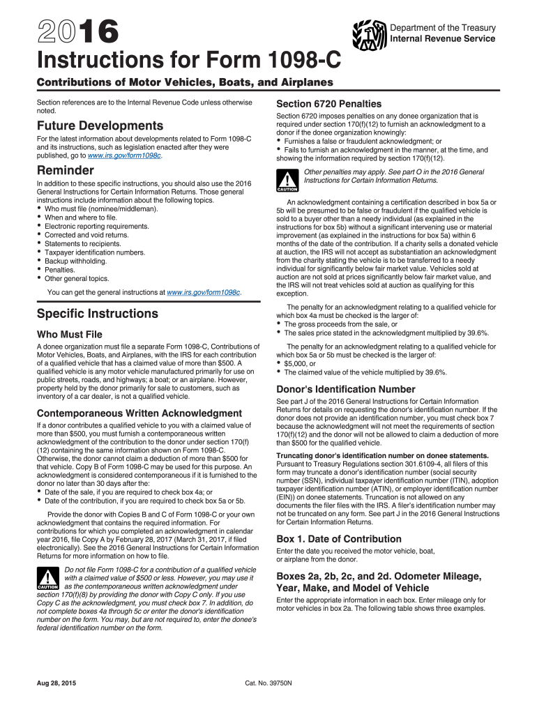2015 Instructions for Form 1098-C Department of the Treasury Internal Revenue Service Contributions of Motor Vehicles, Boats, and Airplanes Section references are to the Internal Revenue Code unless