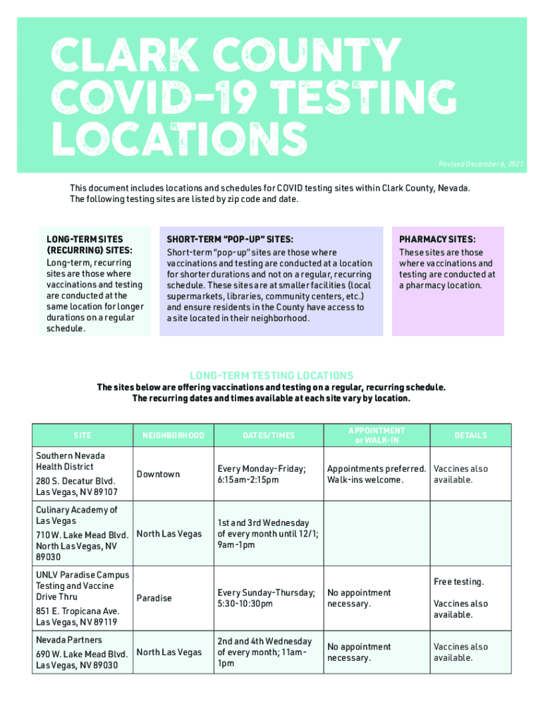 LOCATIONSRevised December 6, 2021This document includes locations and schedules for COVID-19 testing sites within Clark County, Nevada.