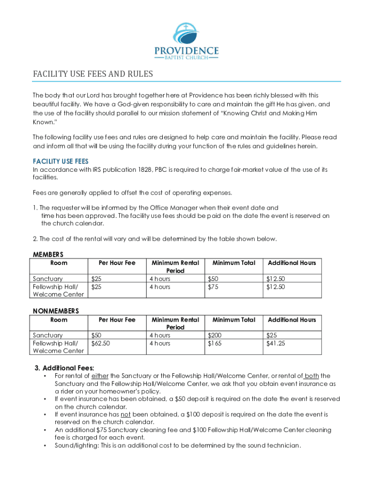FACILITY USE FEES AND RULES The body that our Lord has brought together here at Providence has been richly blessed with this beautiful facility. We have a God given responsibility to care and maintain