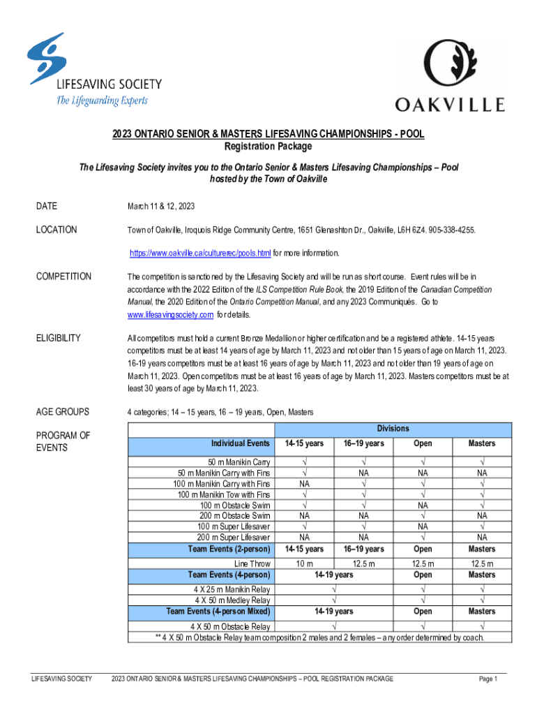 2023 ONTARIO SENIOR & MASTERS LIFESAVING CHAMPIONSHIPS POOL Registration Package The Lifesaving Society invites you to the Ontario Senior & Masters Lifesaving Championships Pool hosted by the Town