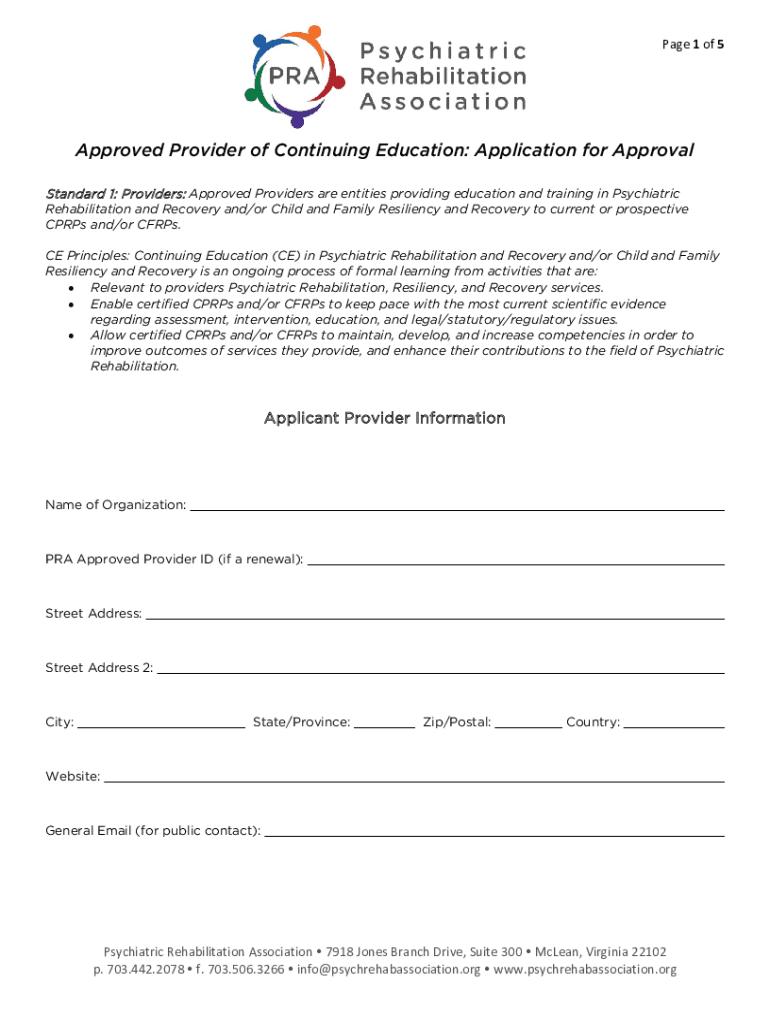 Page 1 of 5Approved Provider of Continuing Education: Application for Approval Standard 1: Providers: Approved Providers are entities providing education and training in Psychiatric Rehabilitation