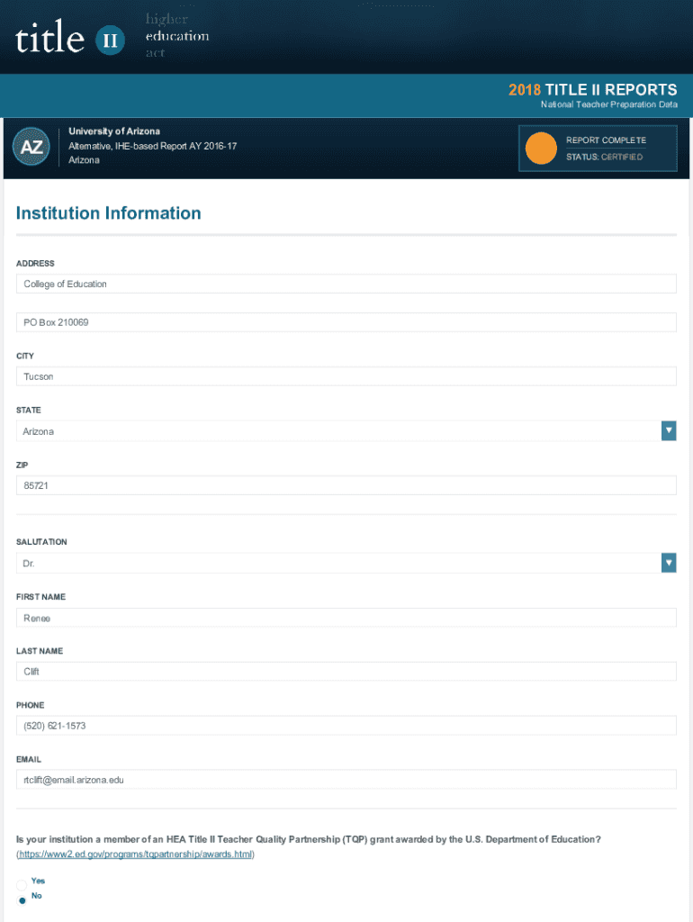 2018TITLEIIREPORTS NationalTeacherPreparationDataAZUniversityofArizona Alternative,IHEbasedReportAY201617 ArizonaREPORTCOMPLETE STATUS:CERTIFIEDInstitutionInformation ADDRESSCollegeofEducationPOBox210069CITYTucsonSTATEArizonaZIP85721SALUTATIONDr.FIRSTNAMEReneeLASTNAMECliftPHONE(520)6211573EMAILrtclift@email.arizona.eduIsyourinstitutionamemberofanHEATitleIITeacherQualityPartnership(TOP)grantawardedbytheU