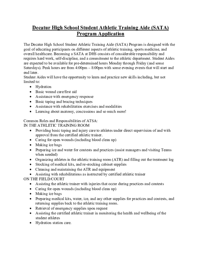 Decatur High School Student Athletic Training Aide (SATA) Program Application The Decatur High School Student Athletic Training Aide (SATA) Program is designed with the goal of educating participants
