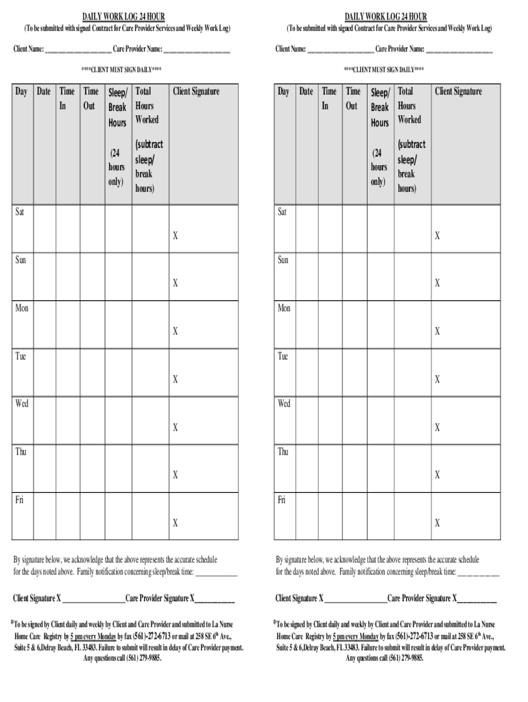 DAILY WORK LOG 24 HOURLY WORK LOG 24 HOUR(To be submitted with signed Contract for Care Provider Services and Weekly Work Log)(To be submitted with signed Contract for Care Provider Services and Weekly