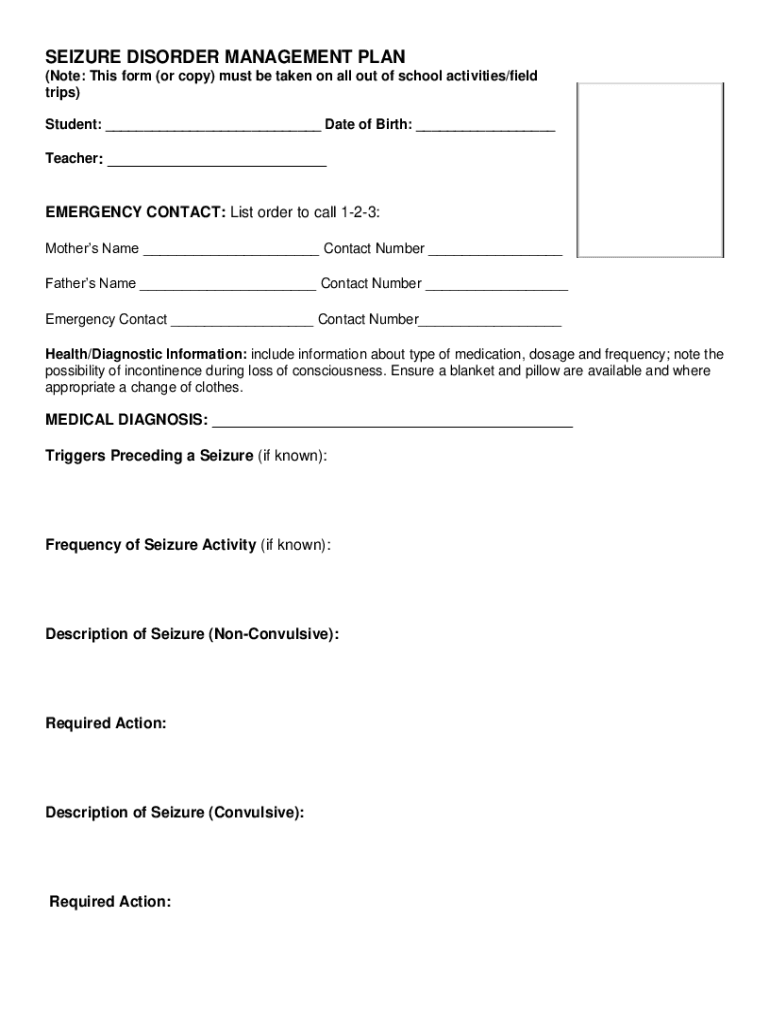 SEIZURE DISORDER MANAGEMENT PLAN (Note: This form (or copy) must be taken on all out of school activities/field trips)Student PhotoStudent: ___ Date of Birth: ___ Teacher: ___EMERGENCY CONTACT: List