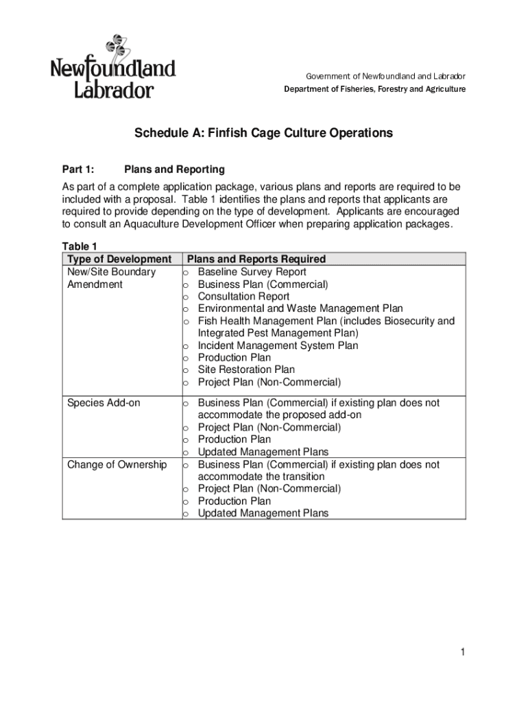 Government of Newfoundland and Labrador Department of Fisheries, Forestry and AgricultureSchedule A: Finish Cage Culture Operations Part 1:Plans and Reporting As part of a complete application package,
