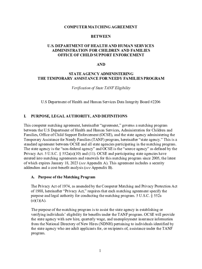 The TANF matching agreement is a formal agreement between state TANF agencies and federal agencies to share information about individuals receiving benefits.