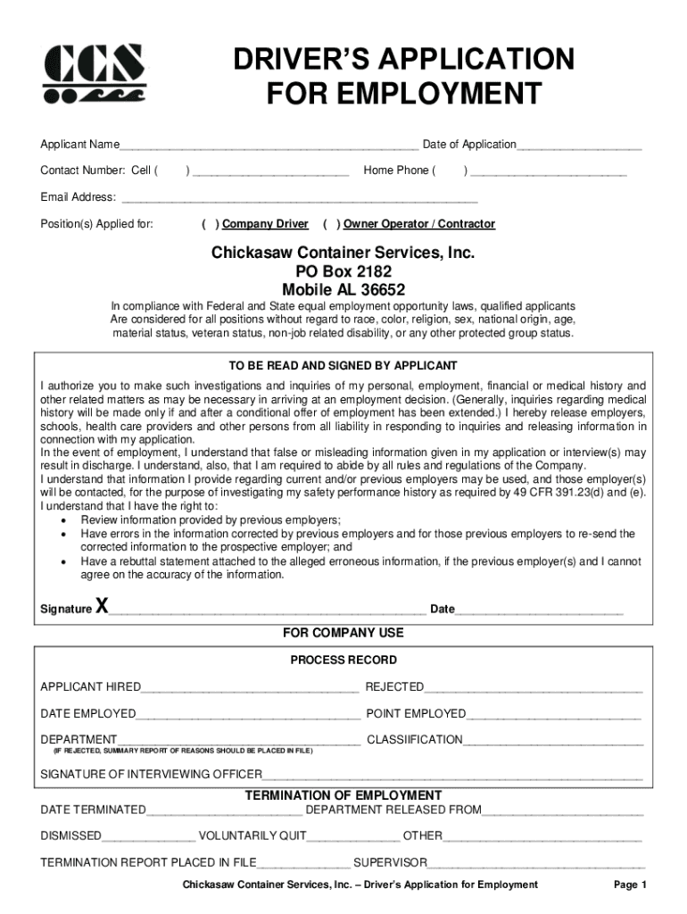 DRIVERS APPLICATION FOR EMPLOYMENT Applicant Name___ Date of Application___ Contact Number: Cell () ___Home Phone () ___Email Address: ___ Position(s) Applied for:() Company Driver() Owner Operator