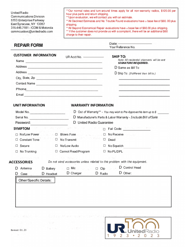 **Our normal rates and tum around times apply for all nonwarranty radios, $120.00 per hour plus parts and return shipping. **Upon evaluation, we will contact you with an estimate. **All Declined Estimates