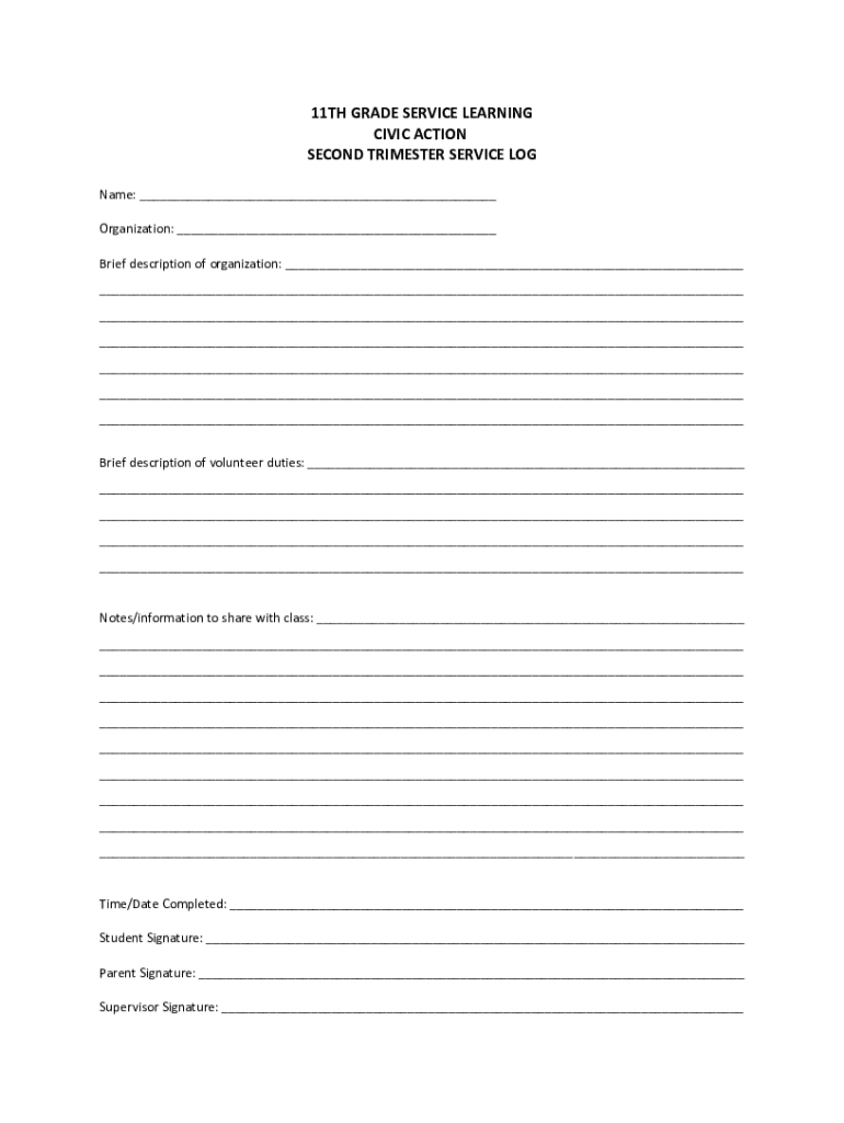 11TH GRADE SERVICE LEARNING CIVIC ACTION SECOND TRIMESTER SERVICE LOG Name: ___ Organization: ___ Brief description of organization: ___ ___ ___ ___ ___ ___ ___ Brief description of volunteer duties: