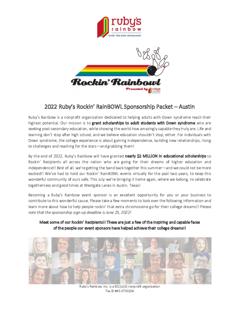 2022 Ruby's Rocking Rainbow Sponsorship Packet Austin Ruby's Rainbow is a nonprofit organization dedicated to helping adults with Down syndrome reach their highest potential. Our mission is to grant