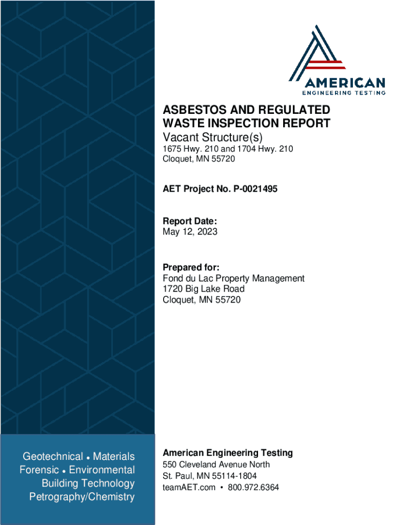 ASBESTOS AND REGULATED WASTE INSPECTION REPORT Vacant Structure(s) 1675 Hwy. 210 and 1704 Hwy. 210 Croquet, MN 55720AET Project No. P0021495Report Date: May 12, 2023Prepared for: Fond du Lac Property