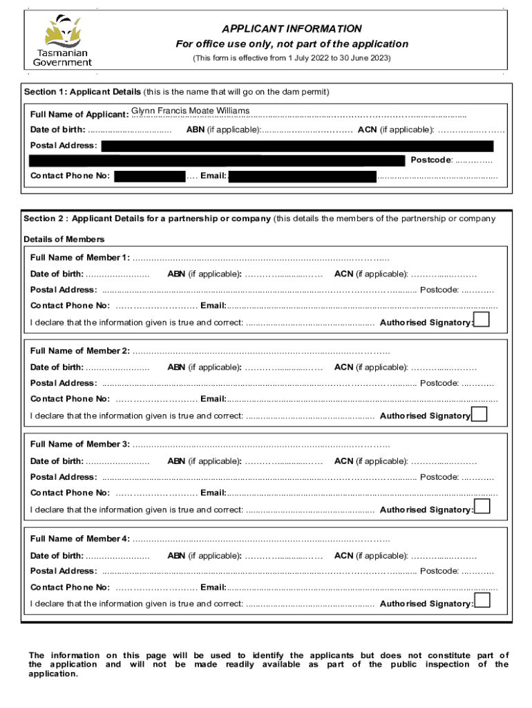 APPLICANT INFORMATION For office use only, not part of the application (This form is effective from 1 July 2022 to 30 June 2023)Section 1: Applicant Details (this is the name that will go on the dam
