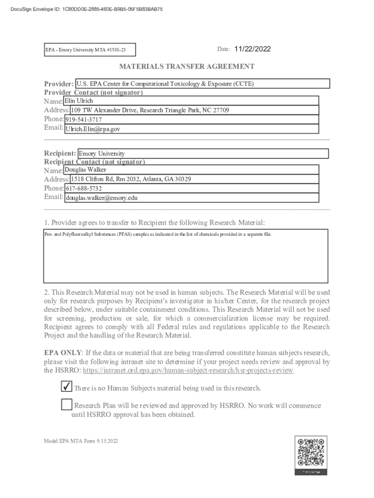 EPA Emory University MTA #150123Date: 11/22/2022MATERIALS TRANSFER AGREEMENT Provider: U.S. EPA Center for Computational Toxicology & Exposure (CITE) Provider Contact (not signatory) Name: Lin Ulrich