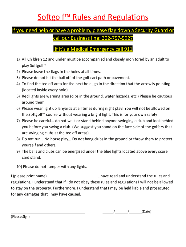 Soft golf Rules and Regulations If you need help or have a problem, please flag down a Security Guard or call our Business line: 3027575927 If it's a Medical Emergency call 911 1) All Children 12