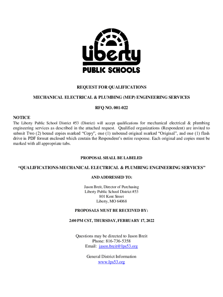 REQUEST FOR QUALIFICATIONS MECHANICAL ELECTRICAL & PLUMBING (MEP) ENGINEERING SERVICES RFQ NO. 001022 NOTICE The Liberty Public School District #53 (District) will accept qualifications for mechanical