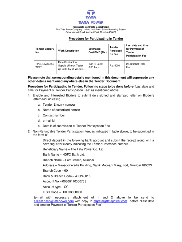 (Corporate Contracts Department) The Tata Power Company Limited, 2nd Floor, Sahara Receiving Station Sahara Airport Road, Adhere East, Mumbai400059Procedure for Participating in Tender Inquiry No.TPCODM/SD/O/