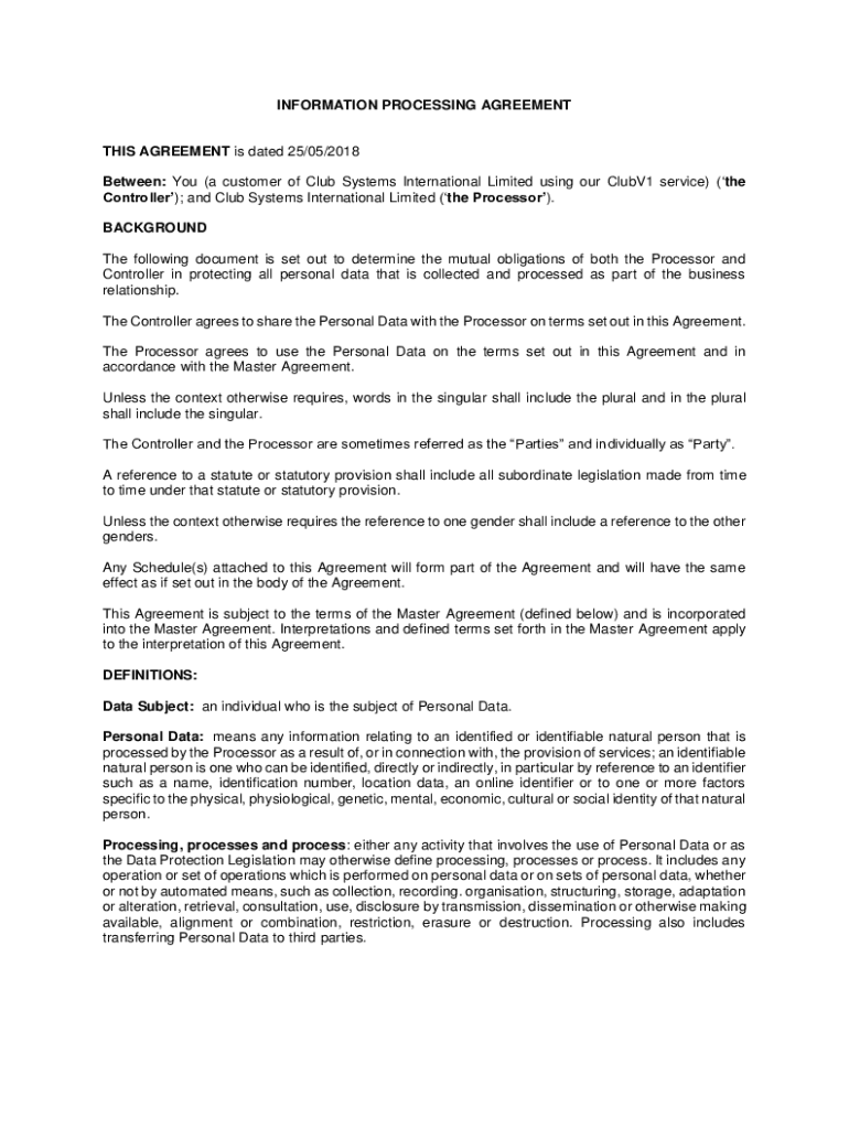 INFORMATION PROCESSING AGREEMENTS AGREEMENT is dated 25/05/2018 Between: You (a customer of Club Systems International Limited using our ClubV1 service) (the Controller); and Club Systems International