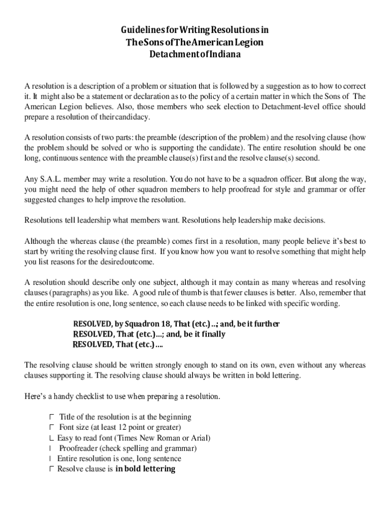 Guidelines for Writing Resolutions in The Sons of The American Legion Detachment of Indiana A resolution is a description of a problem or situation that is followed by a suggestion as to how to correct
