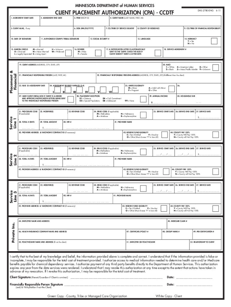 Clear FormMINNESOTA DEPARTMENT of HUMAN SERVICES DHS2780ENGCLIENT PLACEMENT AUTHORIZATION (CPA) CDTF 1. AGREEMENT START DATE2. AGREEMENT END DATE___ / ___ / ___3. PMI# (RECIPE ID)___ / ___ / ___6114.
