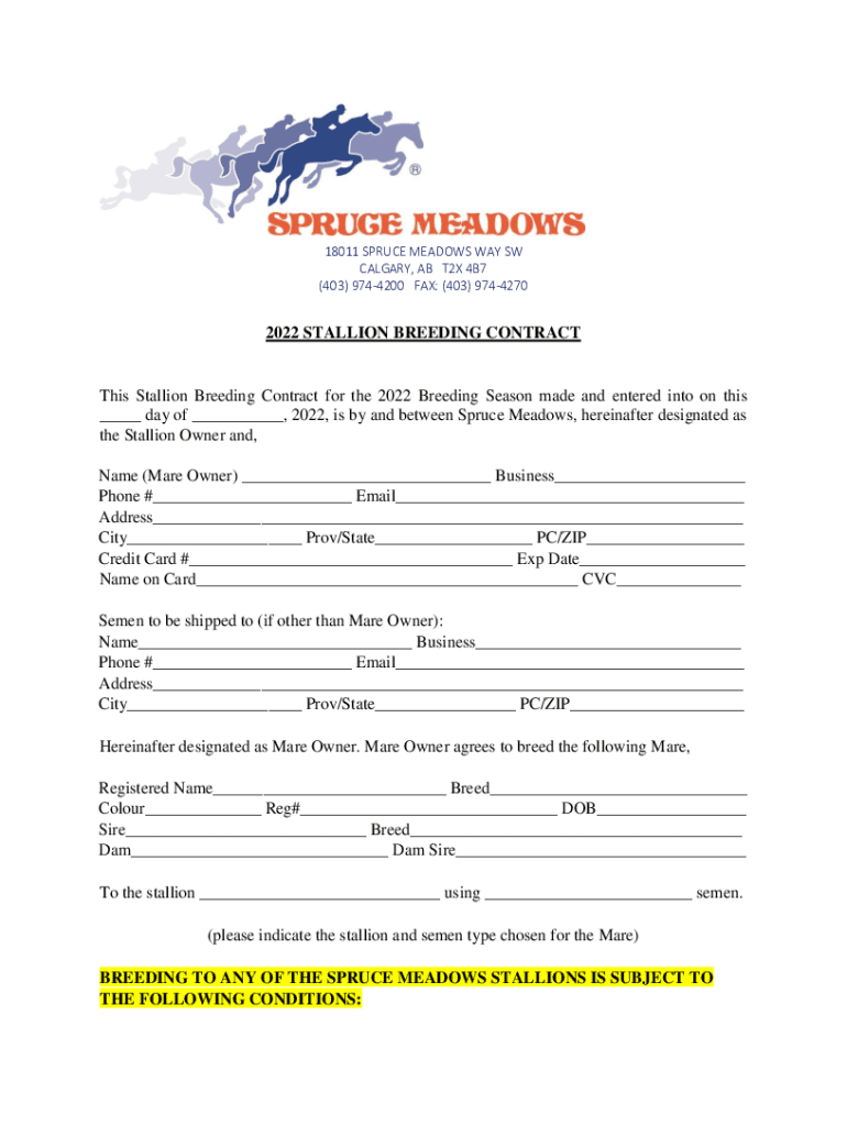 18011 SPRUCE MEADOWS WAY SW CALGARY, AB T2X 4B7 (403) 9744200 FAX: (403) 97442702022 STALLION BREEDING Contracts Stallion Breeding Contract for the 2022 Breeding Season made and entered into on this