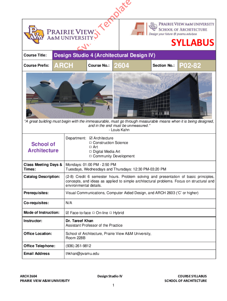 Course Title:Design Studio 4 (Architectural Design IV)Course Prefix:Recourse No.:2604Section No.:P0282A great building must begin with the immeasurable, must go through measurable means when