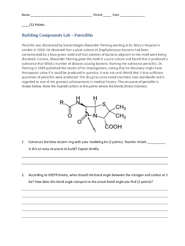 Name ___ Period ___ Date ______/12 PointsBuilding Compounds Lab was discovered by bacteriologist Alexander Fleming working at St. Mary\'s Hospital in London in 1928. He observed that a plate culture