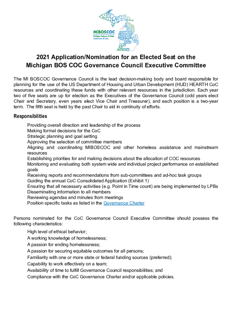2021 Application/Nomination for an Elected Seat on the Michigan BOS COC Governance Council Executive Committee The MI BOS COC Governance Council is the lead decision-making body and board responsible