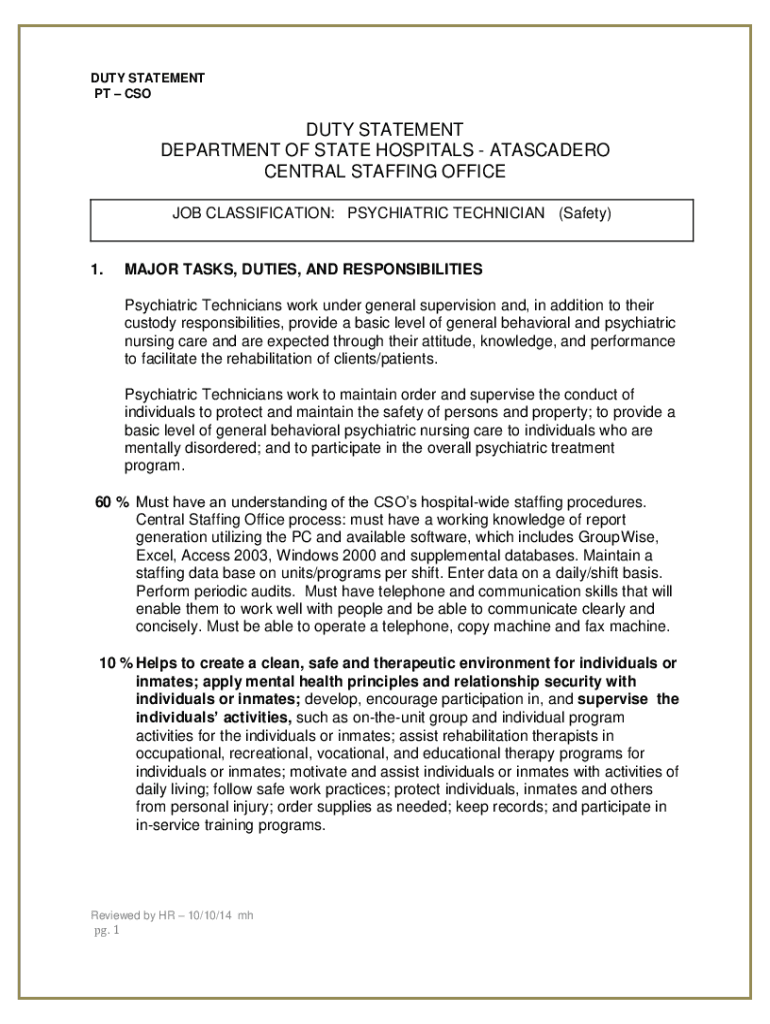 DUTY STATEMENT PT SOUTH STATEMENT DEPARTMENT OF STATE HOSPITALS ATASCADERO CENTRAL STAFFING OFFICE JOB CLASSIFICATION: PSYCHIATRIC TECHNICIAN (Safety)1.MAJOR TASKS, DUTIES, AND RESPONSIBILITIES Psychiatric