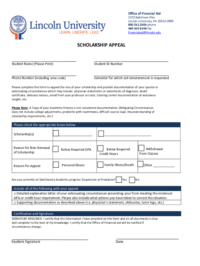 Office of Financial Aid 1570 Baltimore Pike Lincoln University, PA 193520999 8005612606 phone 4843658198 fax financialaid@lincoln.eduSCHOLARSHIP APPEALStudent Name (Please Print)Student ID NumberPhone