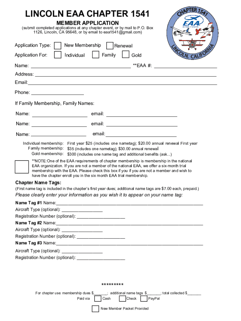 LINCOLN EAA CHAPTER 1541 MEMBER APPLICATION(submit completed applications at any chapter event, or by mail to P.O. Box 1126, Lincoln, CA 95648, or by email to eaa1541@gmail.com)Application Type:New