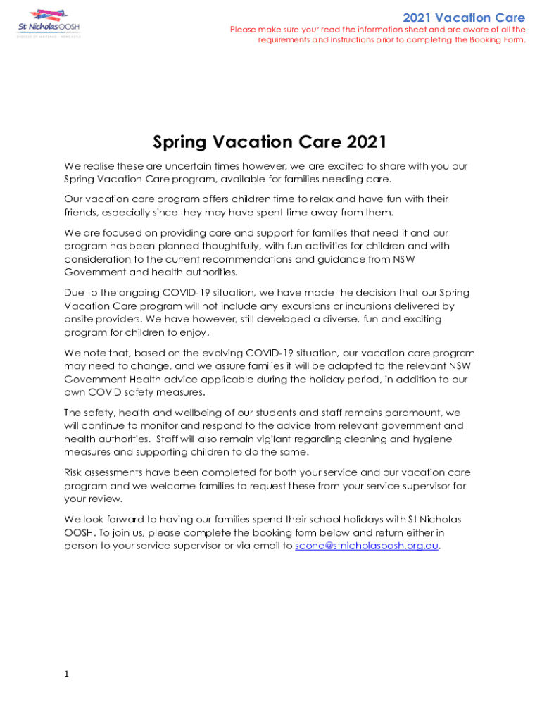 2021 Vacation Care Please make sure your read the information sheet and are aware of all the requirements and instructions prior to completing the Booking Form. Spring Vacation Care 2021 We realize