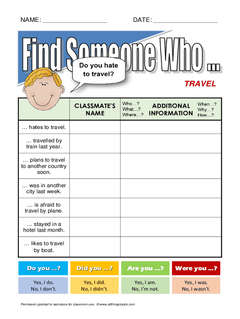 NAME: ___DATE: ___TRAVEL CLASSMATES NAMEADDITIONAL INFORMATION hates to travel. Travelled by train last year. Plans to travel to another country soon. Was in another city last week. Is afraid to travel