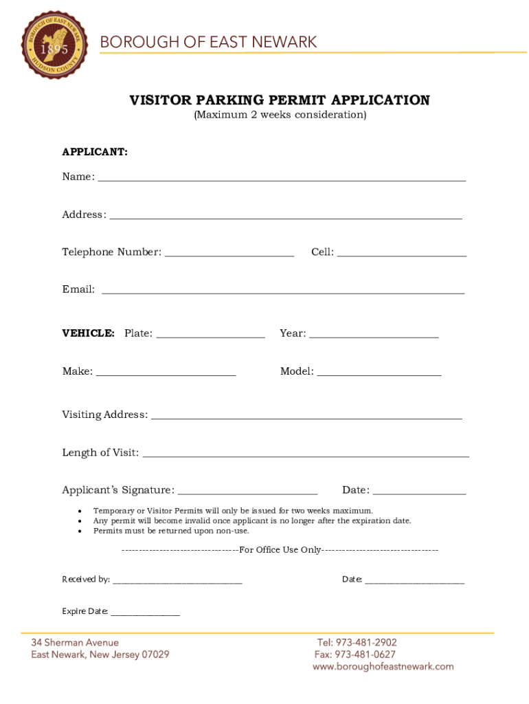 BOROUGH OF EAST NEWARK VISITOR PARKING PERMIT APPLICATION (Maximum 2 weeks consideration) APPLICANT: Name: ___ Address: ___ Telephone Number: ___Cell: ___Email: ___VEHICLE: Plate: ___Year: ___Make: