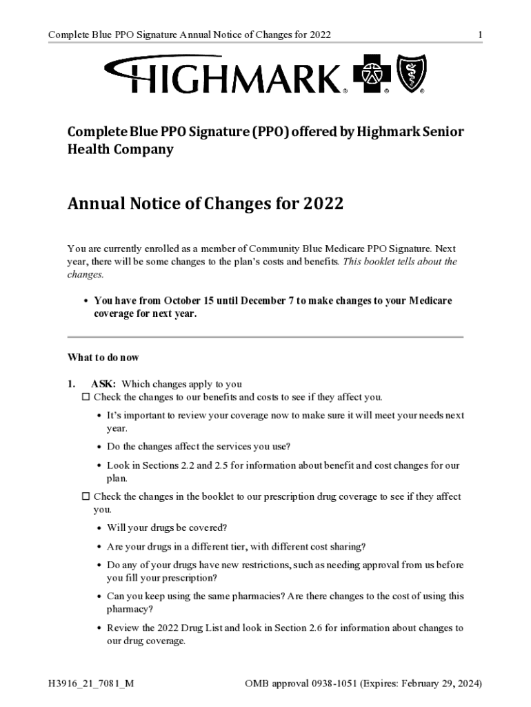 Complete Blue PPO Signature Annual Notice of Changes for 20221Complete Blue PPO Signature (PPO) offered by High mark Senior Health CompanyAnnual Notice of Changes for 2022 You are currently enrolled